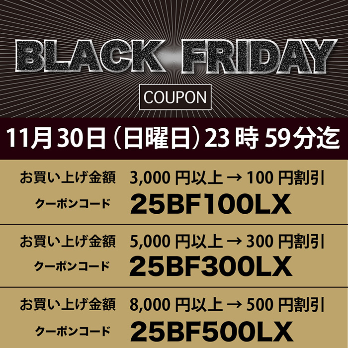 LXでは、本日20日(木)18時より「ブラックフライデー」クーポンキャンペーンを実施致します。期間は11月30日(日)23時59分まで。3,000円以上お買い上げで100円割引クーポン、5,000円以上お買い上げで300円割引クーポン、8,000円以上お買い上げで500円割引クーポン(それぞれ送料、手数料を除く商品お買い上げ金額)をご利用いただけます。この機会をお見逃しなく!※お支払い画面「割引クーポン」の項目の「引き換えコード」欄にクーポンコードをご記入ください。期間中1回ご利用いただけます。